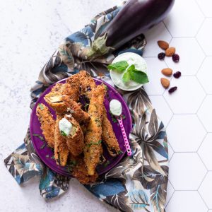 Bastoncini croccanti di melanzana con doppia panatura di panko, mandorle e mirtilli rossi