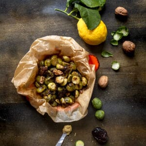 La cottura va in forno, ventilato a 200°: i cavoletti di Bruxelles devono solo essere puliti e tagliati a metà e poi conditi con una sorta di emulsione preparata con sciroppo d’acero, senape , olio, succo di limone, sale e pepe e poi con un trito di datteri e noci.
