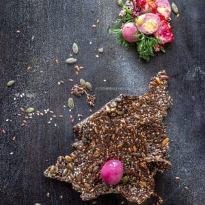 Eccomi come promesso con l’ultima ricetta per questa settimana prima della Pasqua: crakers di soli semi senza sale né condimento con salmone affumicato e uova in rosso.