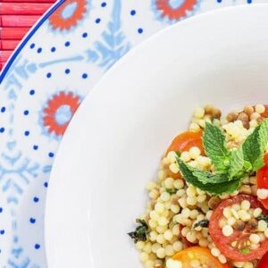 Oggi vi propongo un primo piatto estivo, fresco e facilissimo da preparare: fregola in insalata con pachino, menta e basilico.