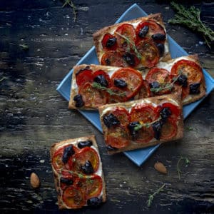 Spero davvero che la ricetta della frolla salata ricotta, mandorle tritate e timo con pomodori e olive nere al profumo di limone possa stuzzicarvi.