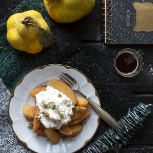 Eccomi con la terza ricetta leggera della settimana che ci serve, come abbiamo detto più volte, a prendere le distanze con calma e senza stress dagli eccessi delle feste appena passate: mele cotogne alla cannella con panna lucida e pistacchi.