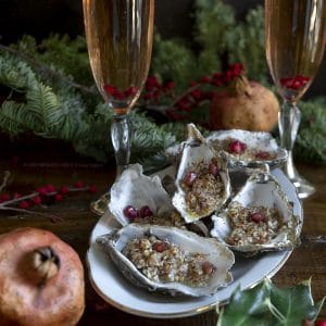 Ostriche gratinate con burro alle mandorle e chicchi di melograno