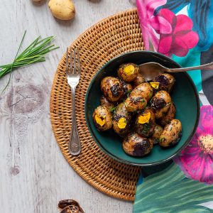 Oggi quindi parto le patate novelle arrosto in insalata con aglio nero ed erba cipollina: un’idea salata che vuole sfatare due falsi miti.
