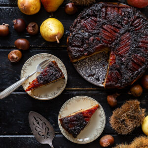 Questa torta rovesciata con pere caramellate e castagne al Rum è buonissima subito ma, se posso dirla tutta, è altrettanto o ancora più buona anche dopo qualche giorno (se mai dovesse avanzarne un pezzetto): questo è possibile grazie allo spessore delle pere che regalano una buona dose di umidità e morbidezza e soprattutto proprio grazie alla base del dolce dalla texture più compatta e sostenuta, per quanto comunque morbida e particolarmente umida.