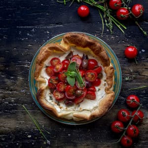 Torta salata con cremoso alle erbe aromatiche, pachino e olive taggiasche