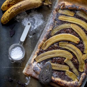 Torta veloce di sfoglia, cioccolato fondente, banane e cannella
