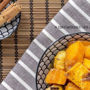 Oggi prepariamo un contorno speciale di quelli che non finiresti mai di mangiare ovvero zucca e castagne speziate allo sciroppo d’acero con cottura al forno.